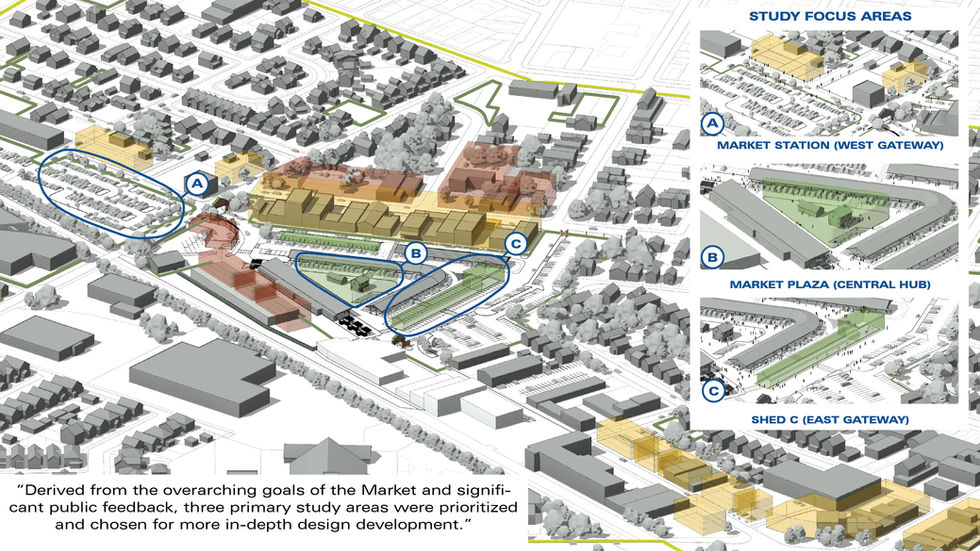 Derived from the overarching goals of the Market, and significant public feedback gathered through multiple outreach events, three primary study areas were prioritized and chosen for more in-depth design development. They included: