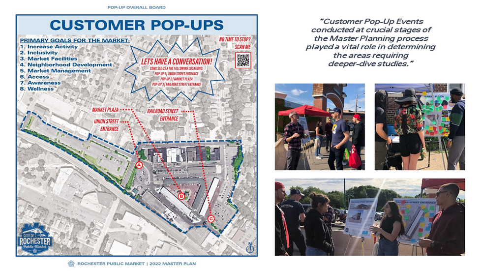 Resulting from a thorough year-long study, the 2022 Rochester Public Market Master Plan provides a comprehensive overview of specific recommendations for proposed development opportunities. This effort has cued up future development to support the Market’s goals ranging from mobility and access, to housing, to customer amenities, to enhanced vendor space, and the introduction of multi-purpose event spaces. The plan includes associated construction cost projections, strategically designed to plan for, and achieve, the Market’s initiatives through practical and tangible enhancements.